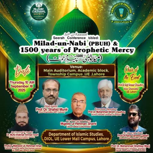The 3rd Annual Seerah Conference titled “Milad-un-Nabiﷺ& 1500 Years of Prophetic Mercy” was held at the University of Education, Lahore, on September 18, 2025. The conference was presided over by Vice Chancellor Prof. Dr. Aqif Anwar Chaudhry. The Chief Guest was Prof. Dr. Shahid Munir TI (Vice Chancellor, UET Lahore), the Keynote Speaker was Prof. Dr. Muhammad Akram Chaudhary (Former Vice Chancellor, University of Sargodha), and the Honorable Guest was Mujeeb-ur-Rehman Shami (Journalist & Columnist)and Dr.Tanveer Qasim Rana UET