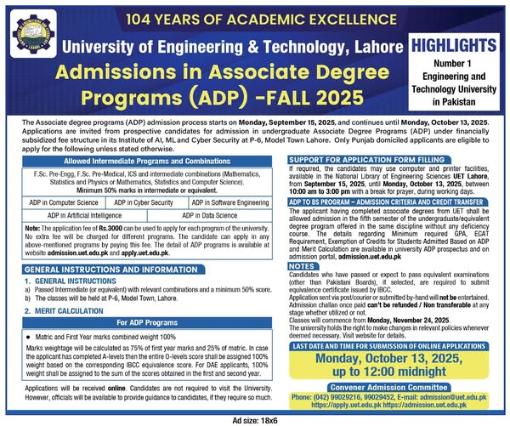 The University of Engineering and Technology (UET) Lahore has announced the upcoming launch of its Associate Degree Program (ADP) for the year 2025. This skills-based, two-year degree program is designed to equip students with practical knowledge and career-oriented expertise, preparing them for future academic and professional opportunities.